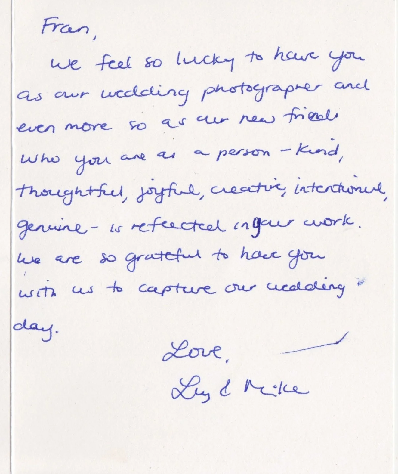 Fran leads with her heart and captures the soul of the couple. You will not just have wedding photos, you will have beautiful artwork that you will cherish forever.